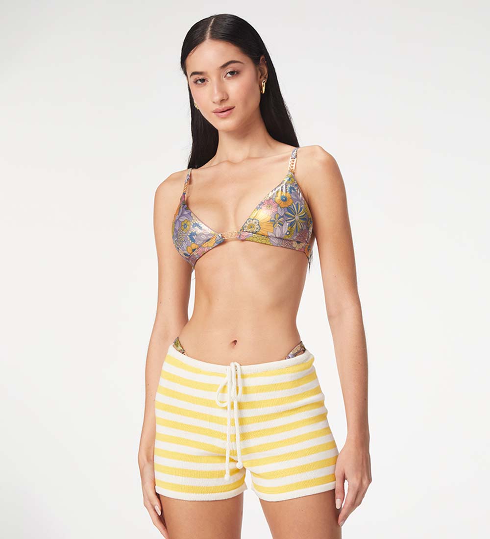 Maddy is what you need for this summer! Striped knitted shorts in ivory and yellow colors, at waist height with adjustable straps. Produced in a sustainable factory and handmade by Peruvian artisans.
