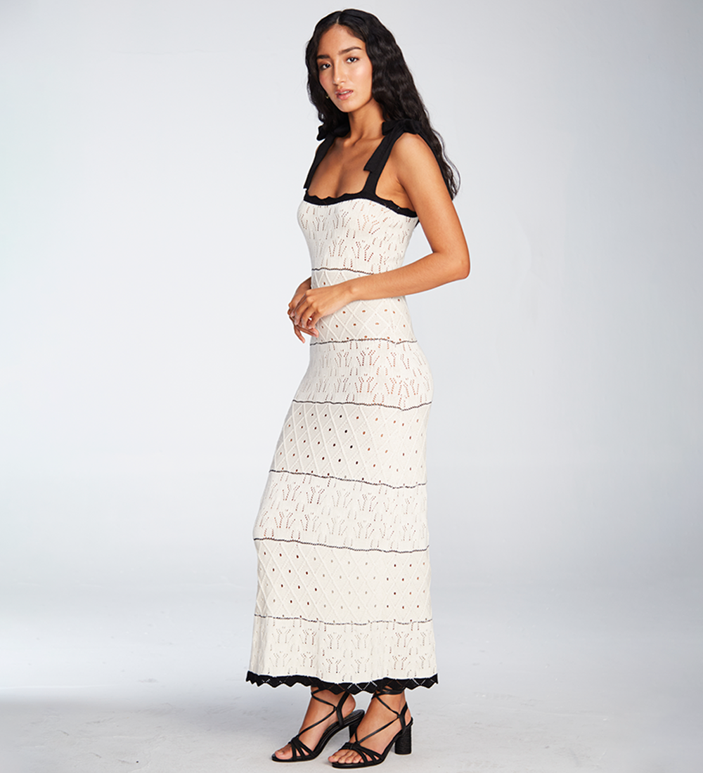 Unique and elegant white dress featuring distinct patterns throughout and black details, creating an elegant and modern look perfect for a sunny day. Ethically produced in a sustainable factory and handcrafted by Peruvian artisans.