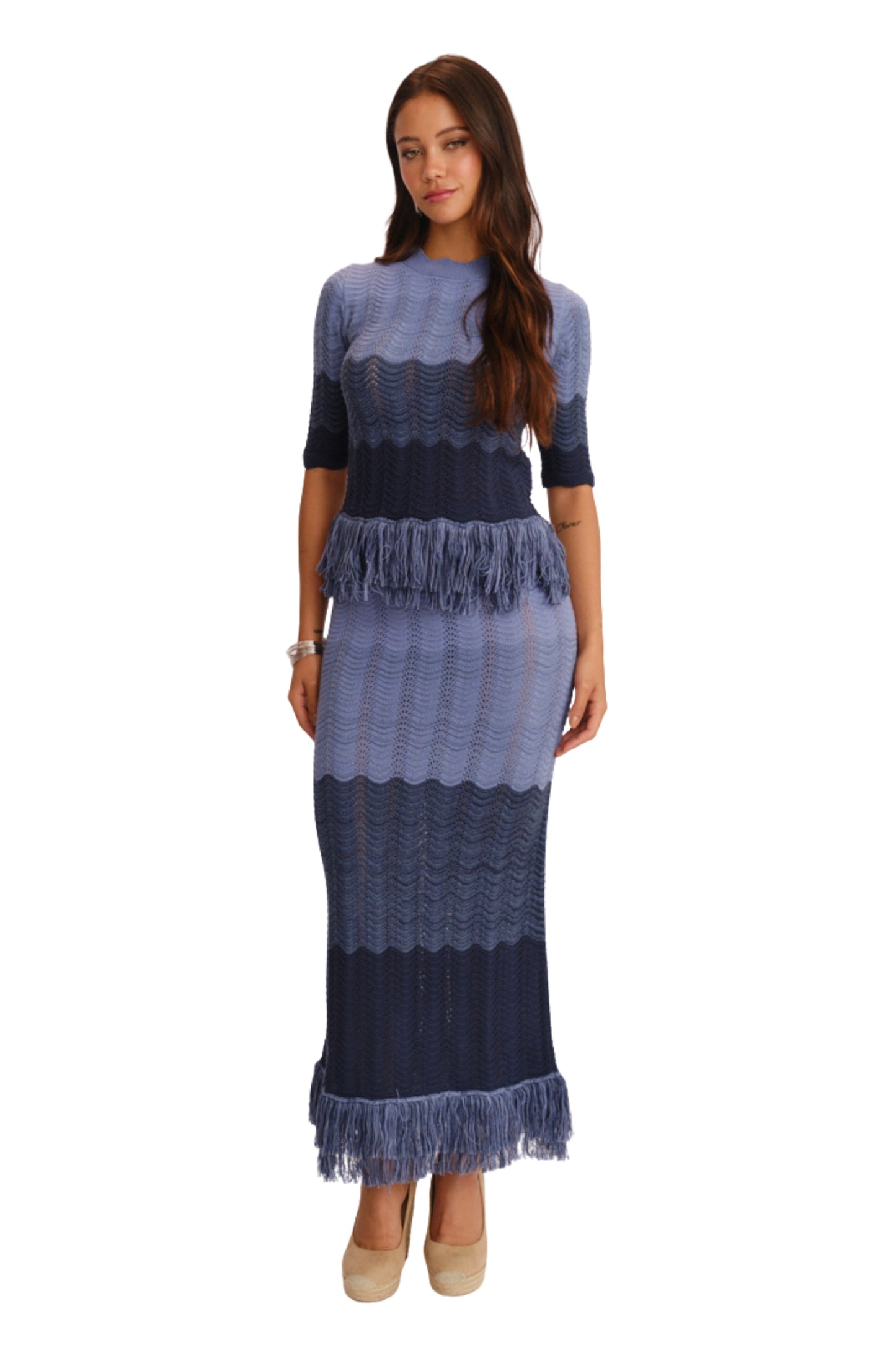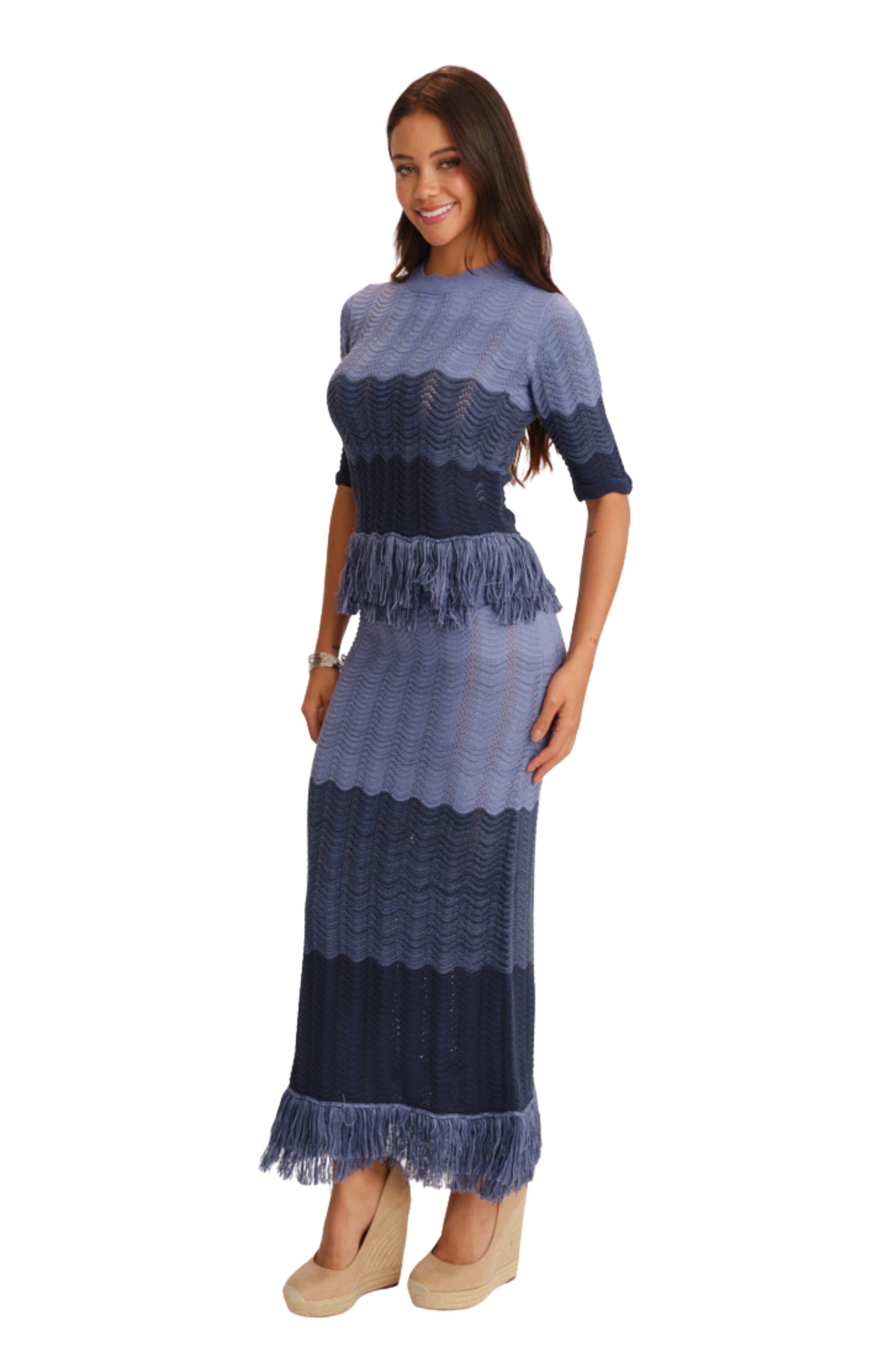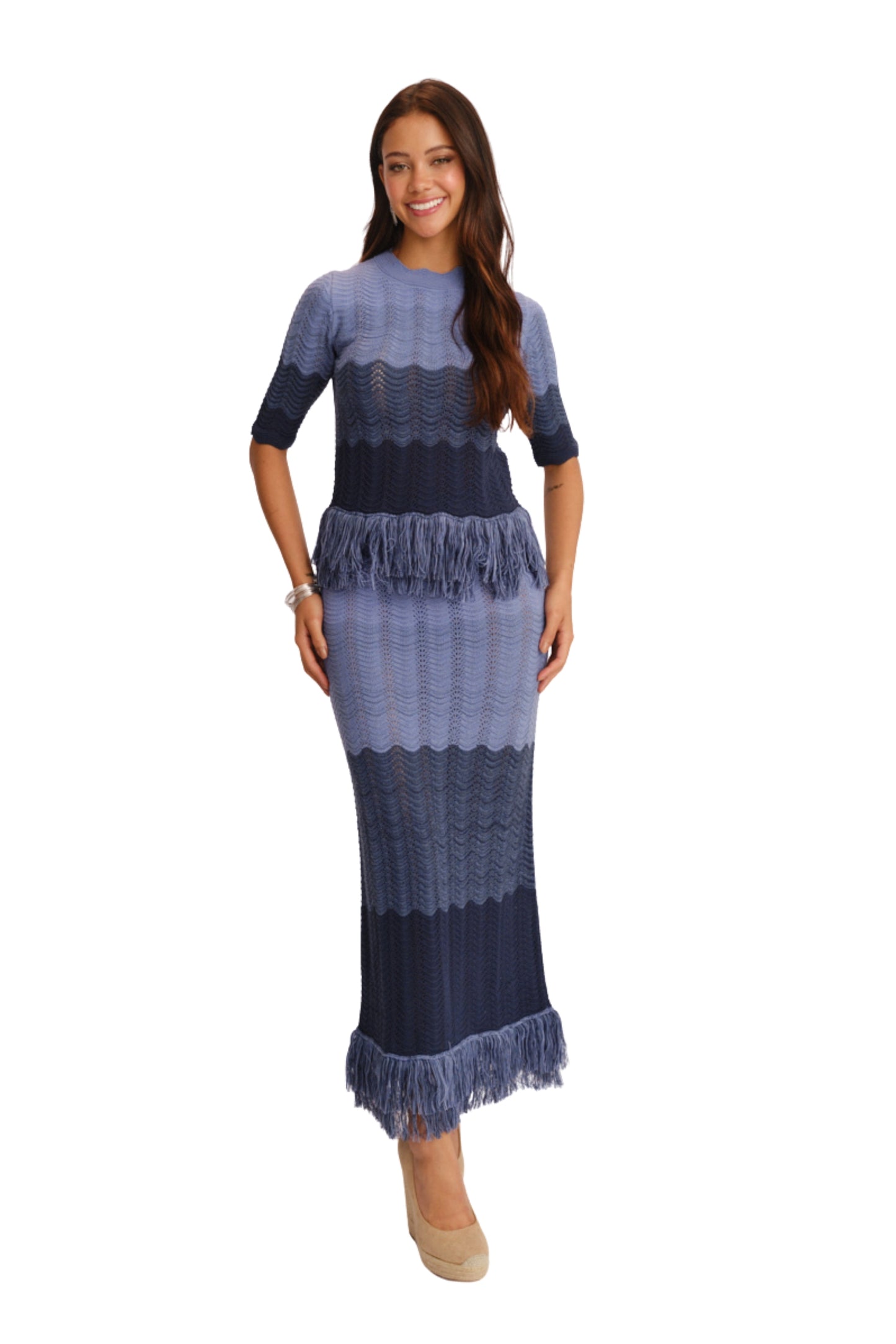 Elegant, original, and flowing. A short-sleeved top with fringed detailing at the waist paired with a long skirt, both featuring a delicate wavy pattern in gradient shades of blue. Its design accentuates the silhouette with a modern and sophisticated air, perfect for those seeking a distinctive look with artisanal style.