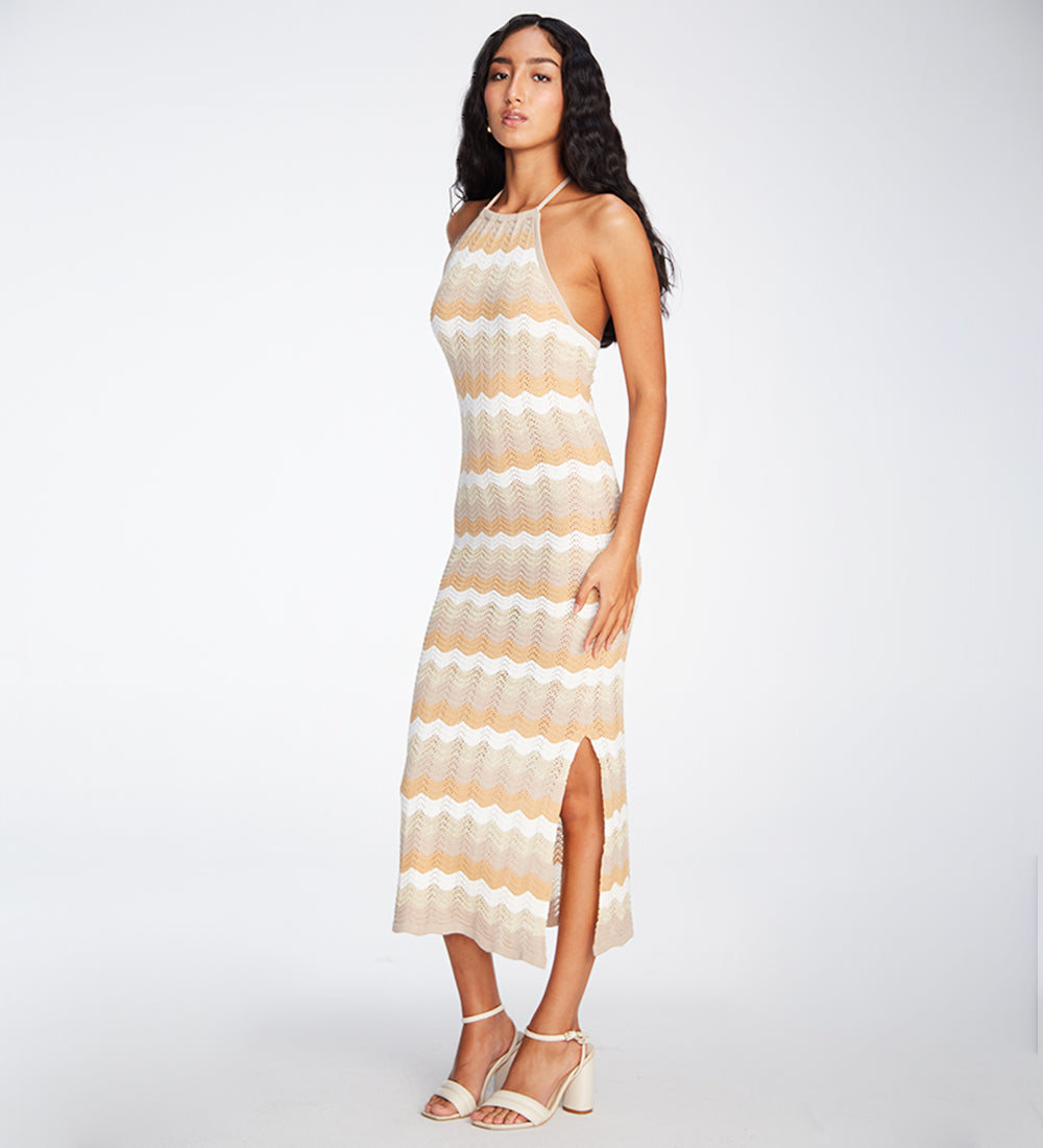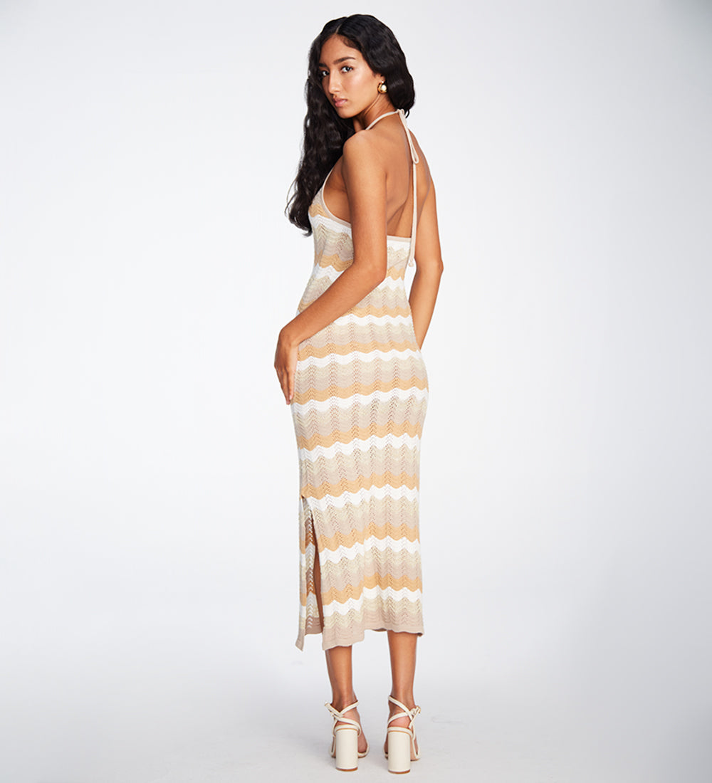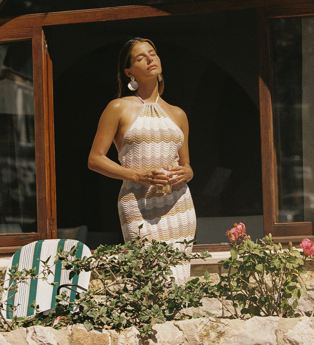 1. Maxi dress woven with a wave design in beige and white tones, with a halter neck that enhances your figure. Perfect for special events where you want to highlight your sophisticated and feminine style. Machine-woven, produced in a sustainable factory and handmade by Peruvian artisans.