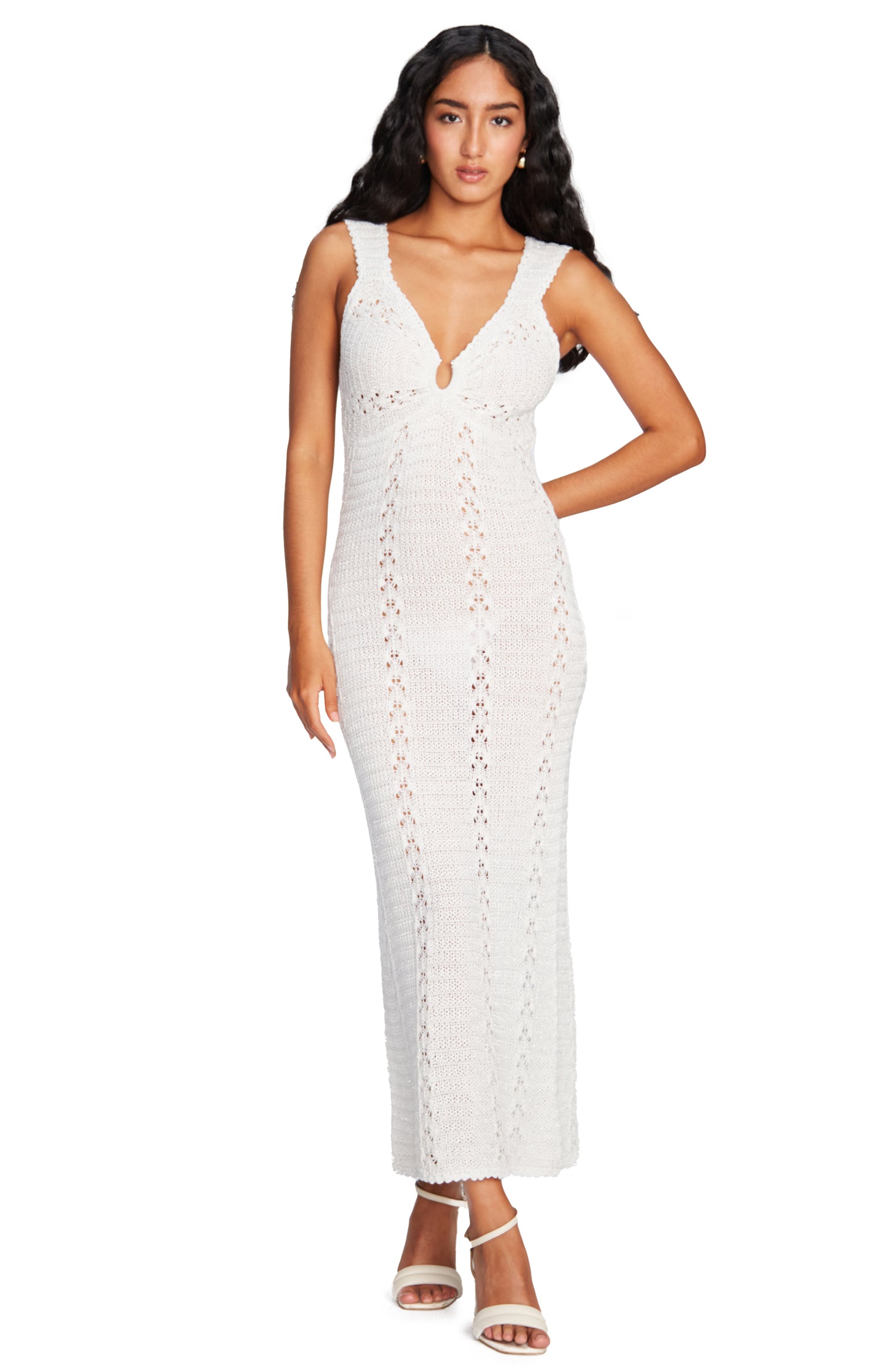 1. This white maxi knitted dress features openwork details and a hoop neckline, with wide shoulder straps for added security and a flattering fit. It also includes a distinctive piping detail at the center of the neckline, adding a unique touch to this elegant design. Machine-knitted with handmade crochet appliqués.