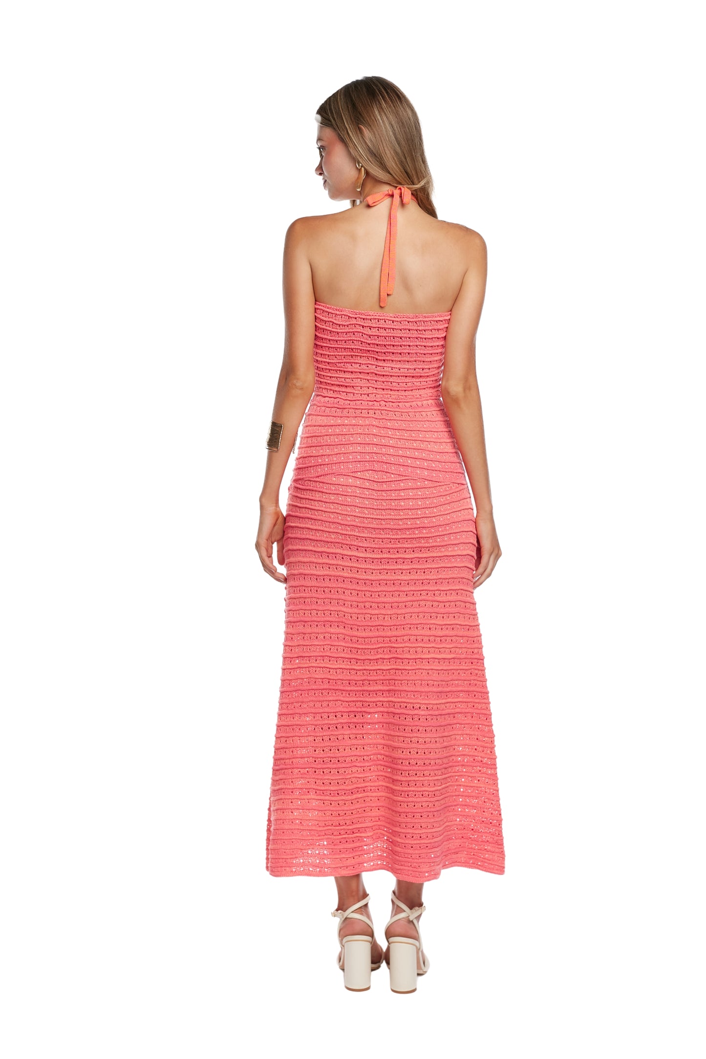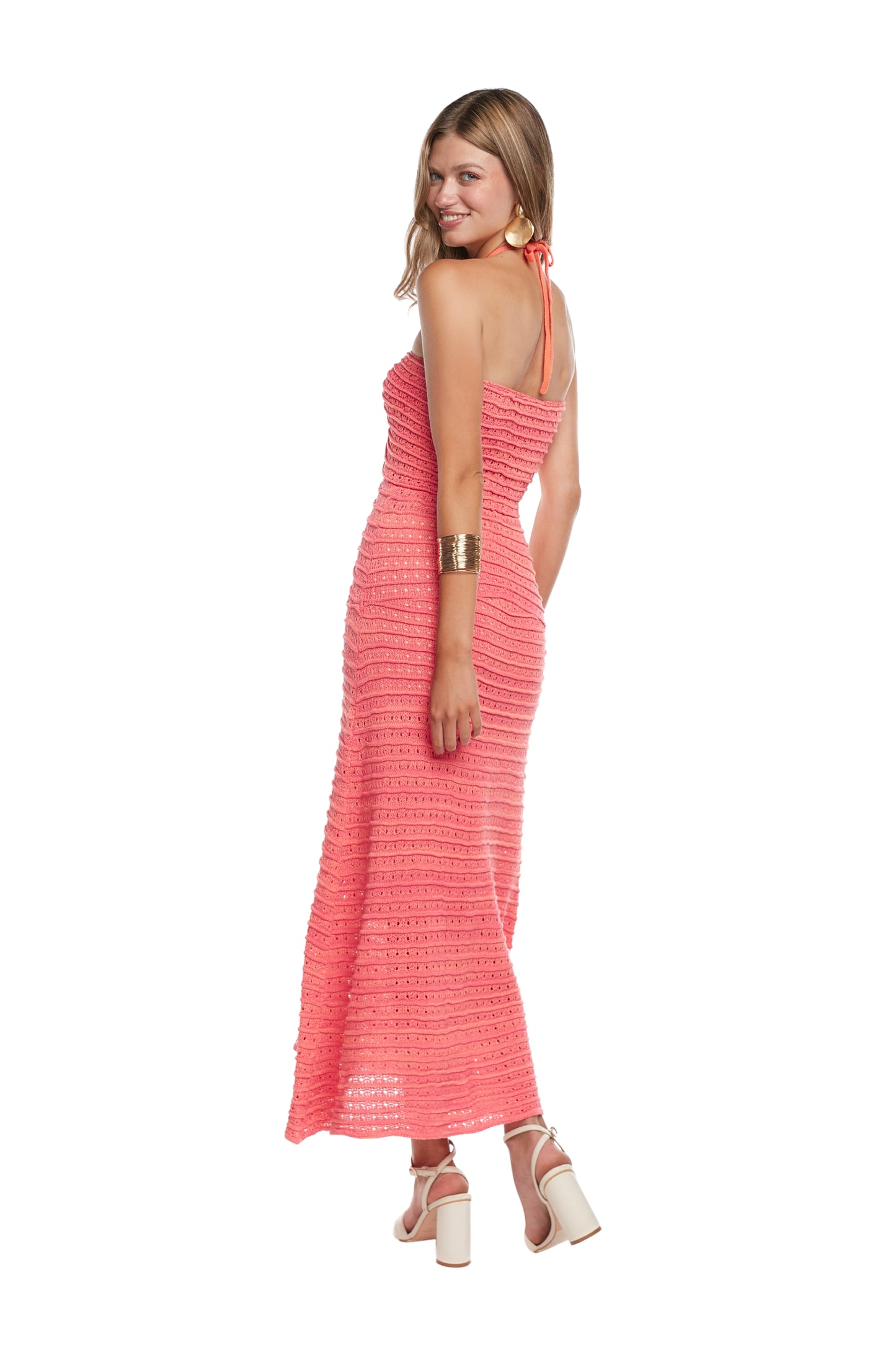 This sunset dress is perfect for a special night by the beach, featuring a seductive central slit and decorative gold star details. With a stylish neck tie, it’s the ideal choice for unforgettable party nights. Machine-woven.