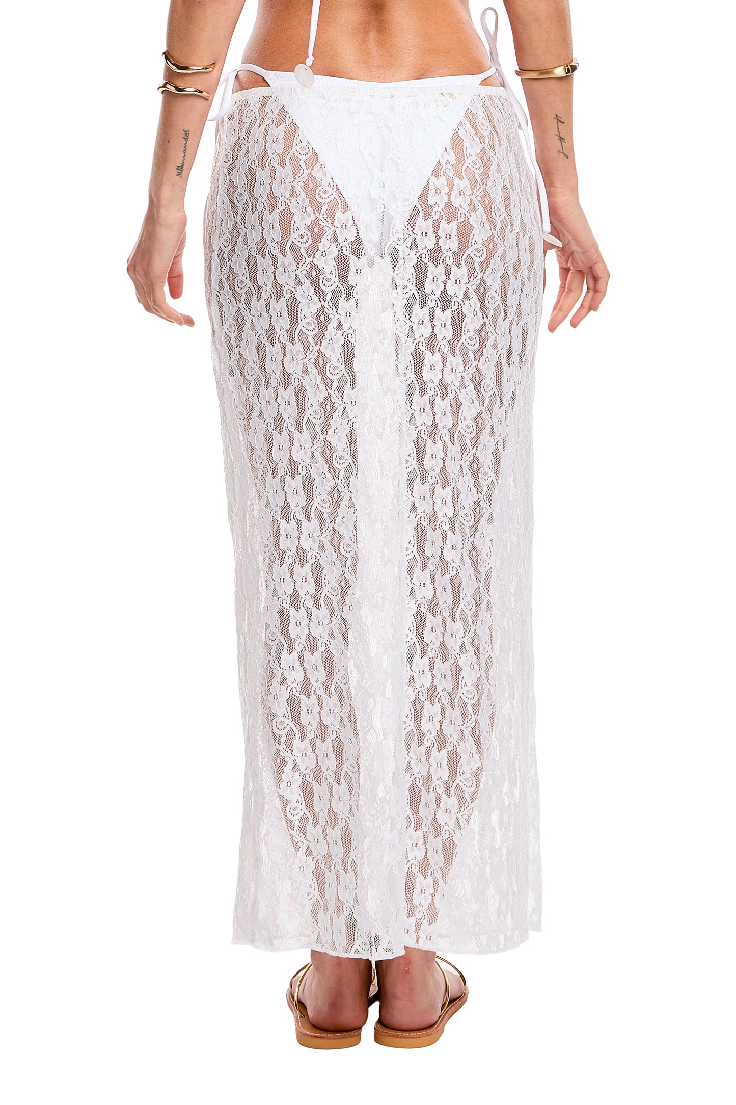 A white skirt with an openwork design that reveals a hint of skin, perfect for wearing over a bikini. With a fresh, bohemian style, a light texture and a soft drape, it's perfect for the beach or pool.