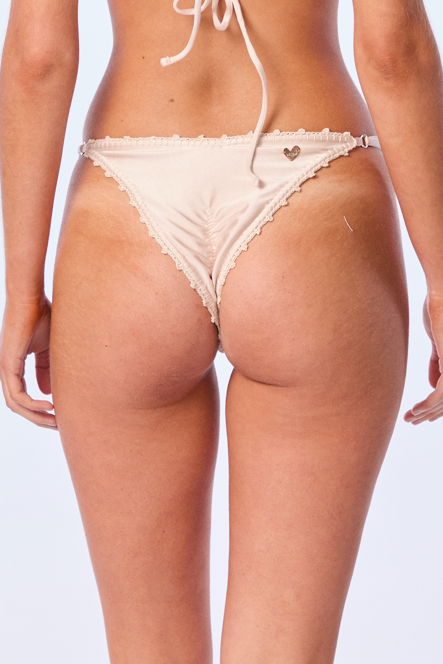 Matching bottom in beige hand-made crochet with lace details, perfect for an elegant and natural look on the beach. Made in an eco-friendly way.