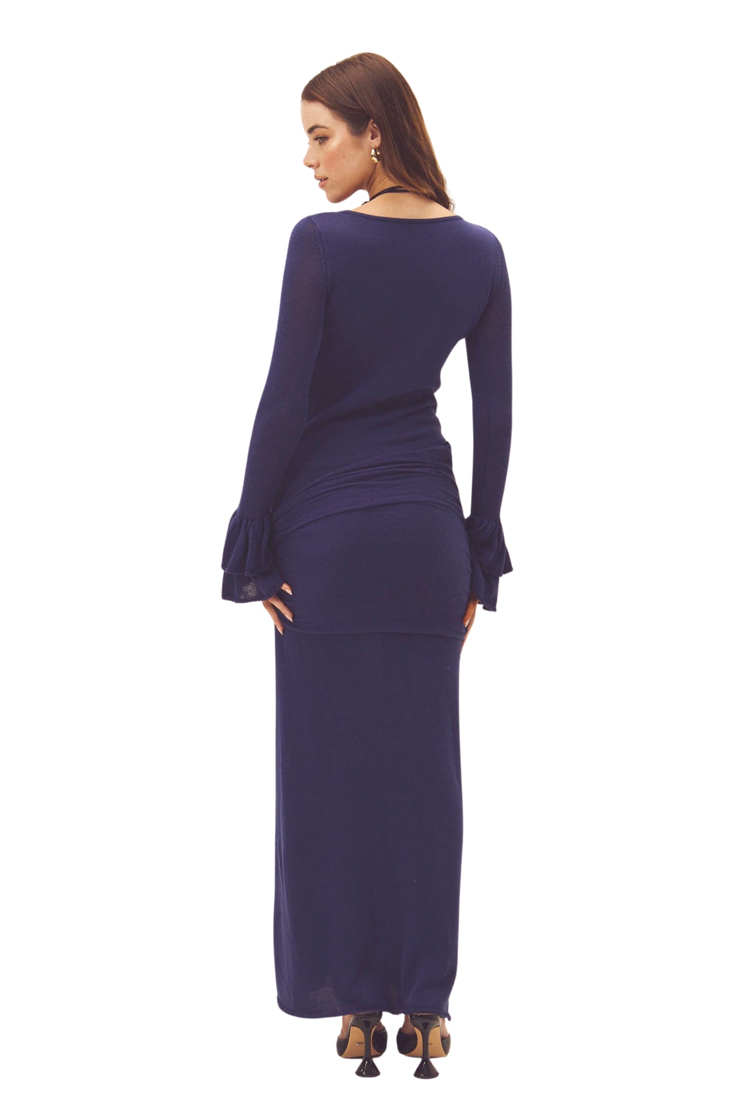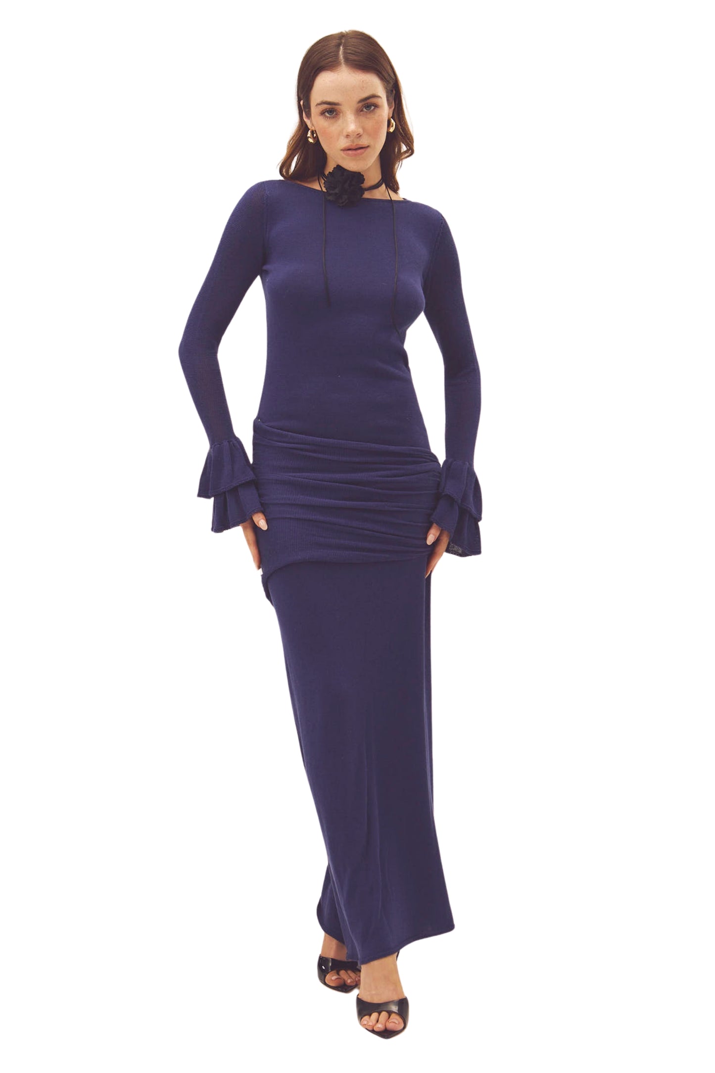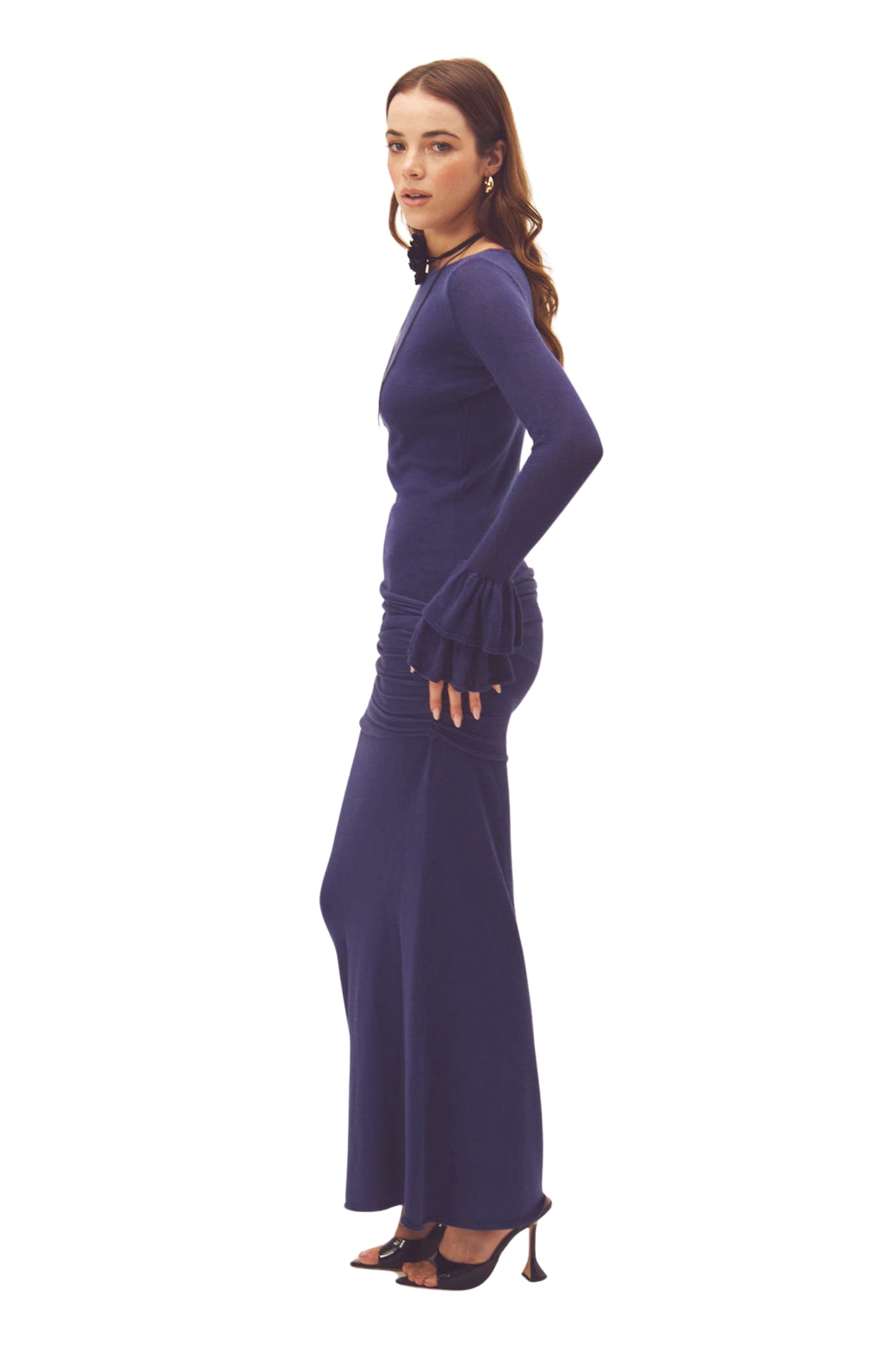 A long dress in a deep blue hue, designed to flatter your figure with a comfortable and streamlined fit. Its fitted silhouette enhances your curves, while the side ruching adds a flattering and feminine touch. The long sleeves with flared cuffs add a delicate and elegant detail, perfect for elevating any look. Its minimalist design makes it a versatile garment, ideal for both special occasions and evening events.