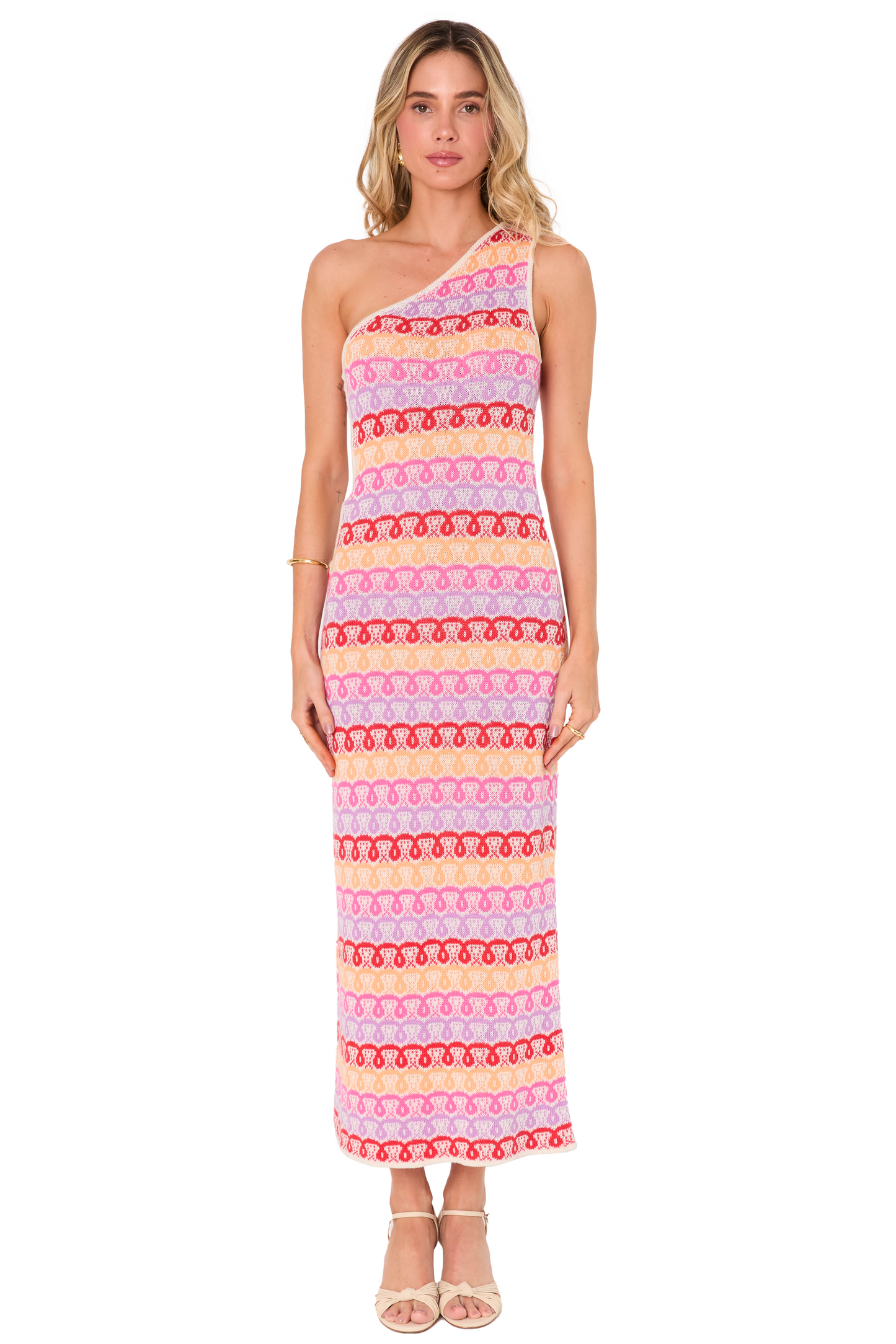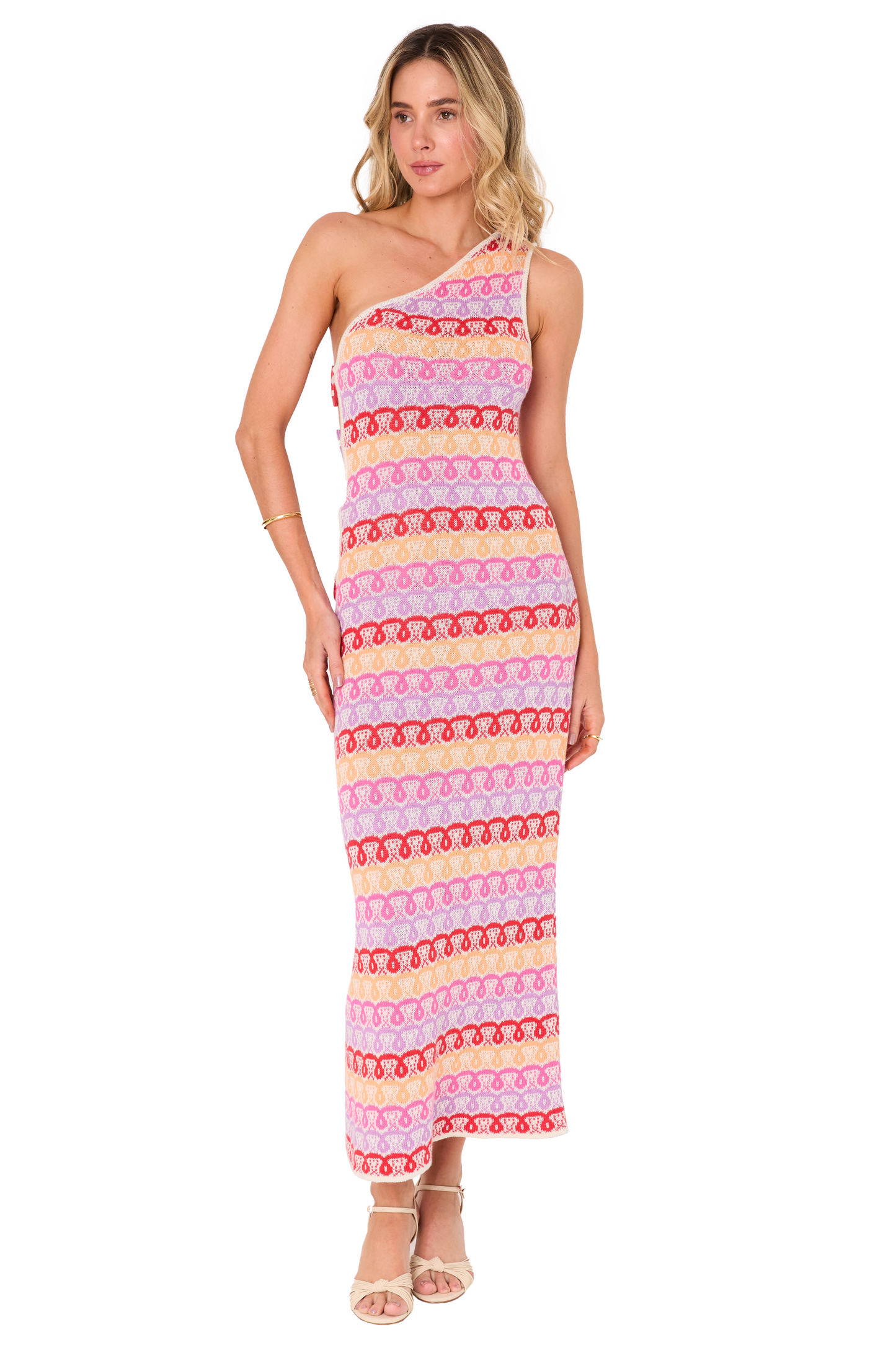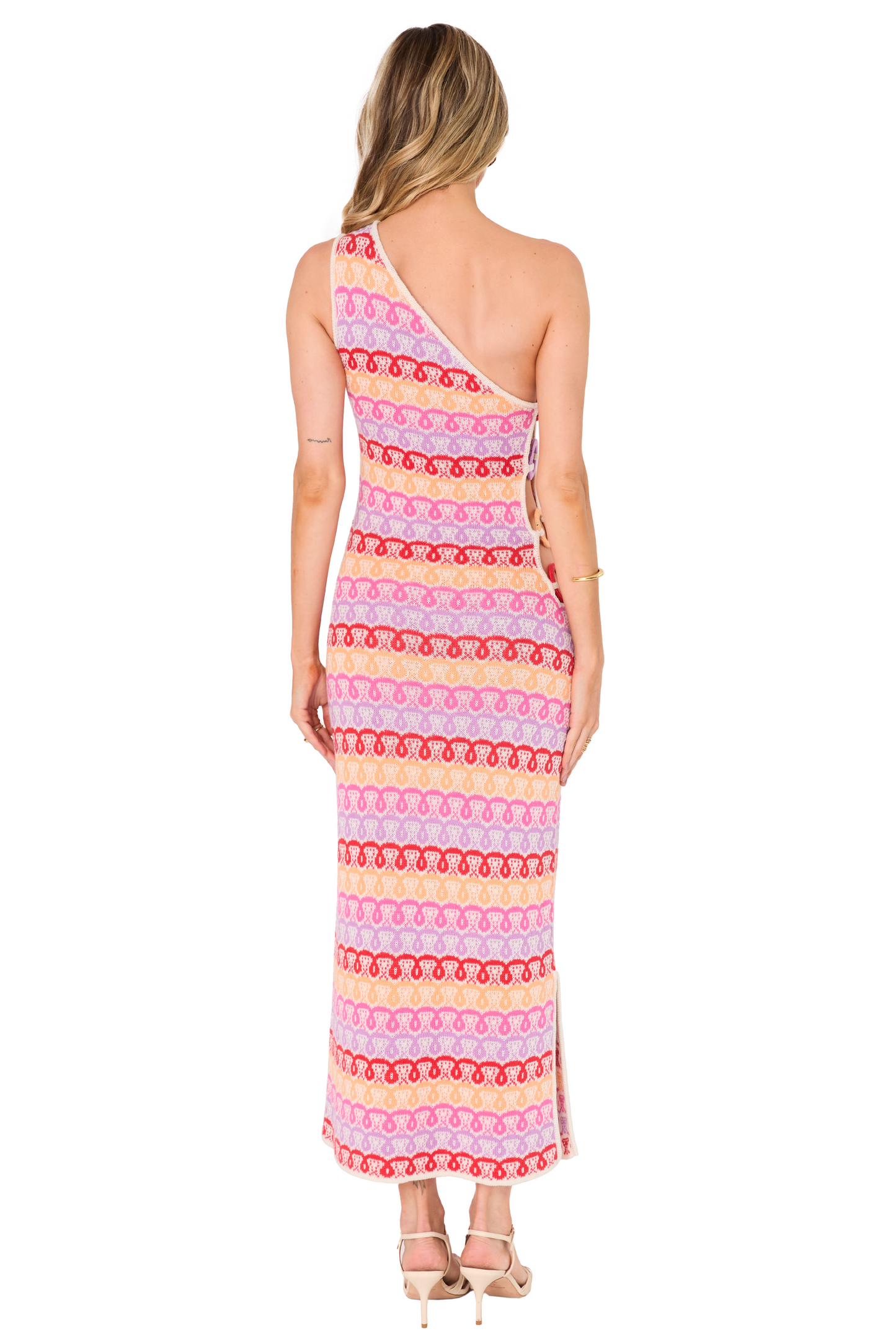 A vibrant, multicolored, long dress full of personality, crafted from a fluid fabric that adapts to the body's movement. It features a suggestive side slit that adds a subtle touch of sensuality, complemented by an ankle slit that stylizes the silhouette and allows you to show off your shoes elegantly. Ideal for special occasions where standing out in style is the order of the day.
