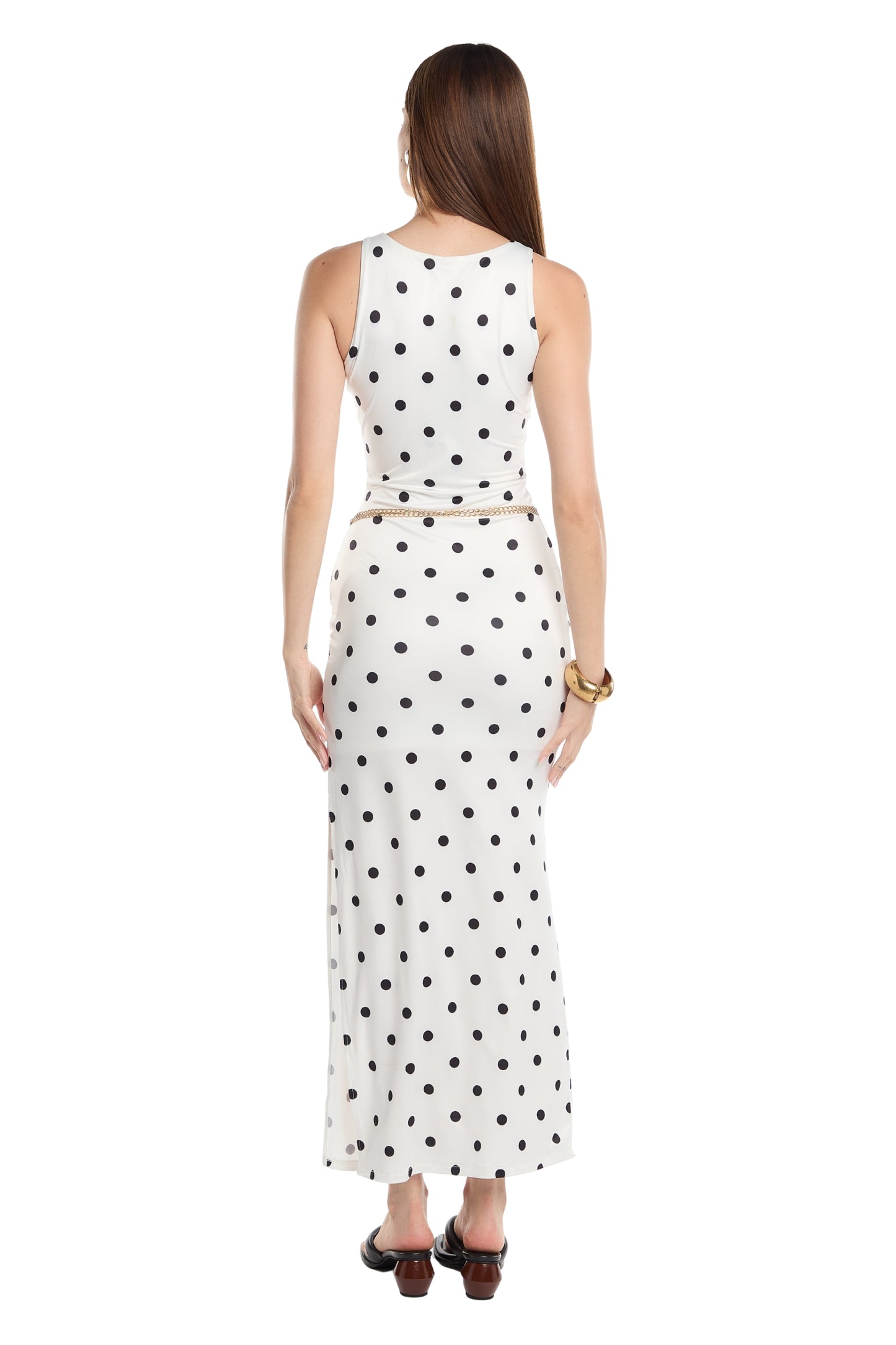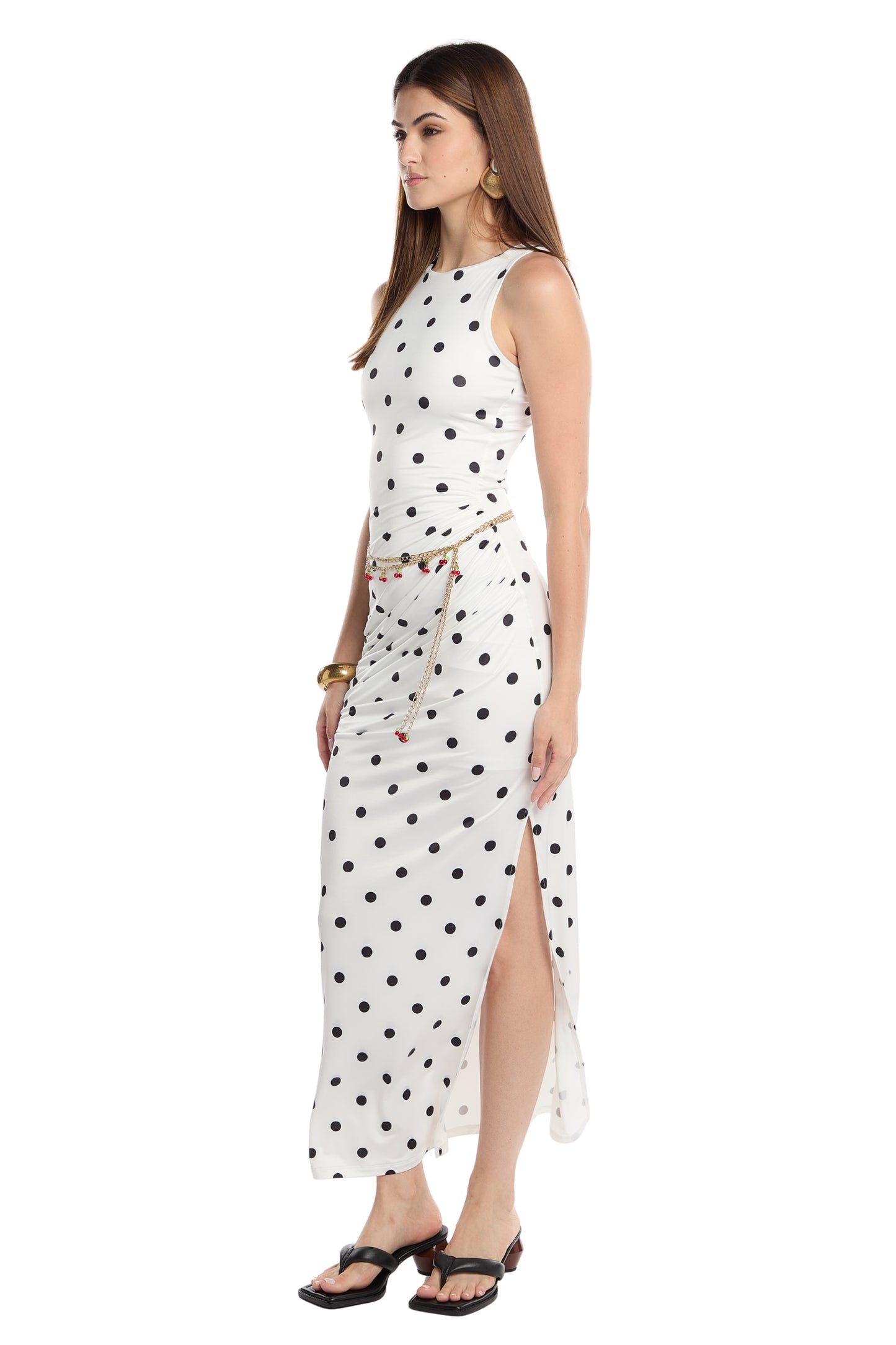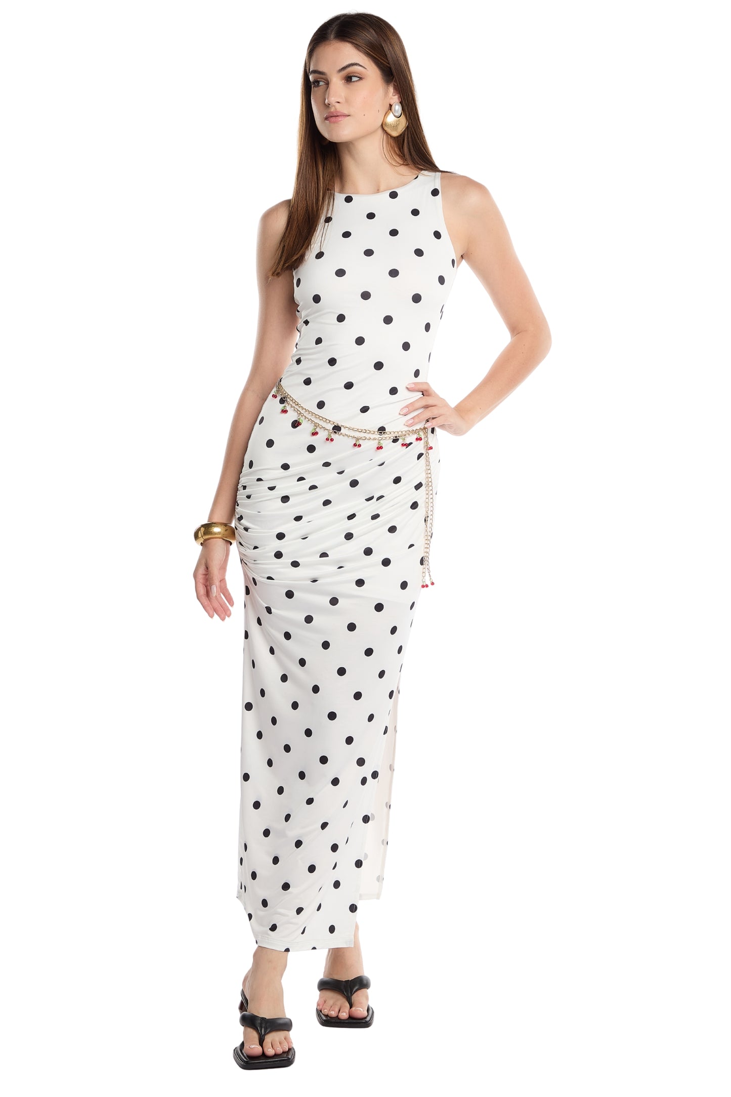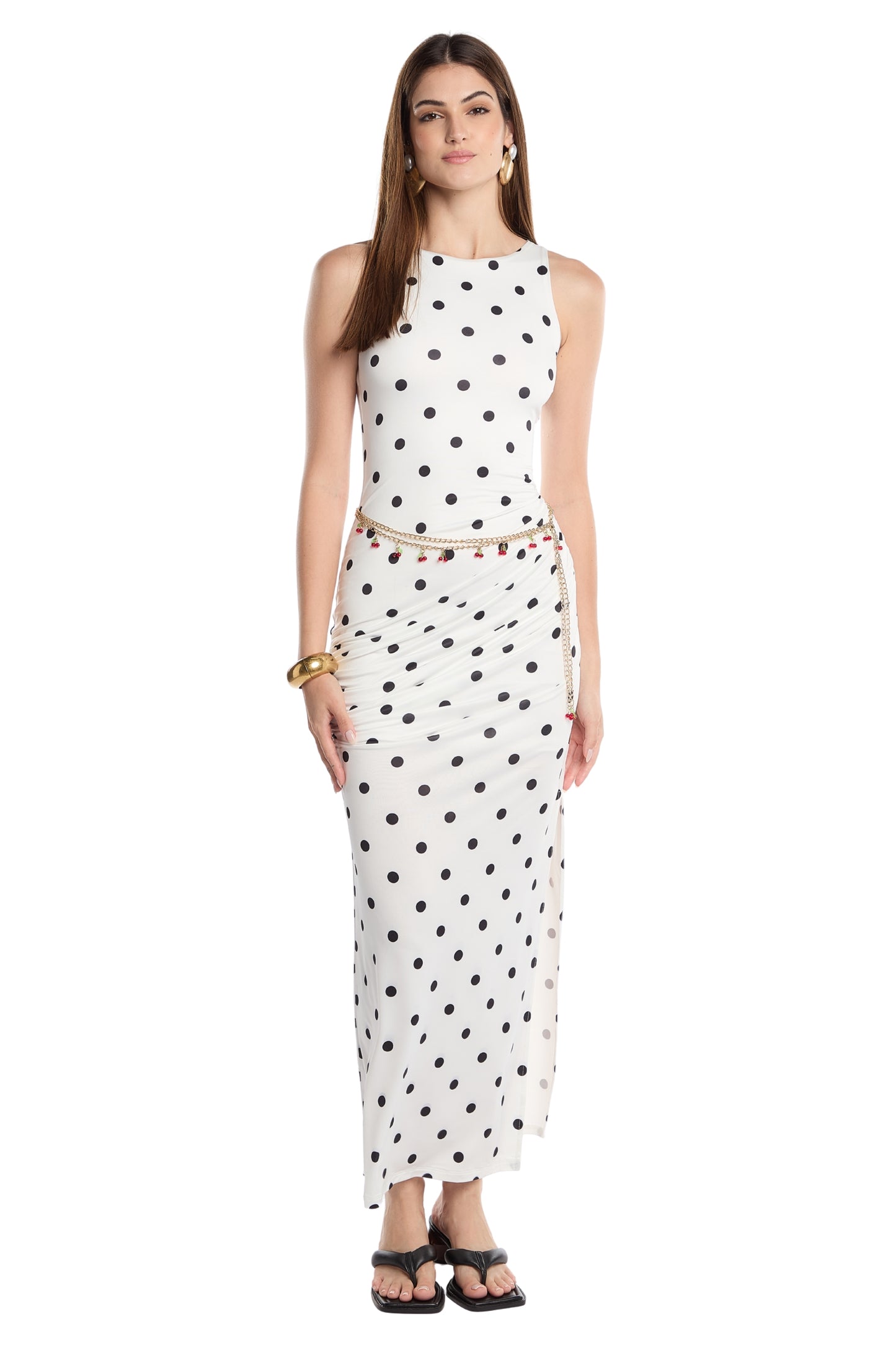 The Gala Polka Dots is a fitted maxi dress with a black and white polka dot print and a high neckline. It features draping at the hip. An elegant piece made in Peru.