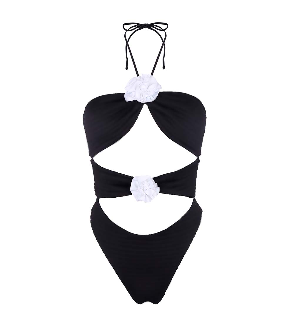 Josefina is back but renewed. Black lycra one-piece with slits, top that ties around the neck, a high-waisted bottom and two removable flowers as a detail. Produced in a sustainable factory and handmade by Peruvian artisans.